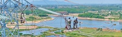 安徽省滁州市珠龍鎮(zhèn)220千伏清(流)環(huán)(漪)輸電工程現(xiàn)場,工人在高空中進(jìn)行組塔作業(yè)。