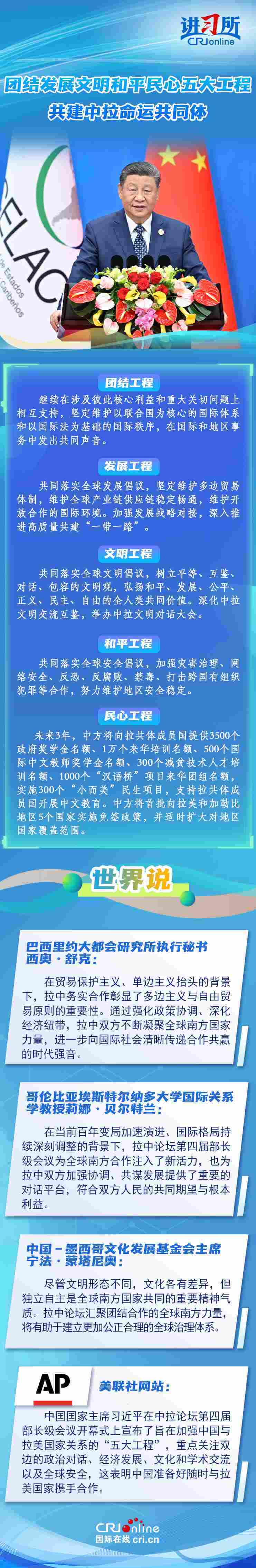5月13日,中國國家主席習近平出席中拉論壇第四屆部長級會議開幕式并發(fā)表主旨講話。習近平宣布,中方愿同拉方攜手啟動五大工程,共謀發(fā)展振興,共建中拉命運共同體。他強調,無論國際風云如何變化,中國始終做拉美和加勒比國家的好朋友、好伙伴。