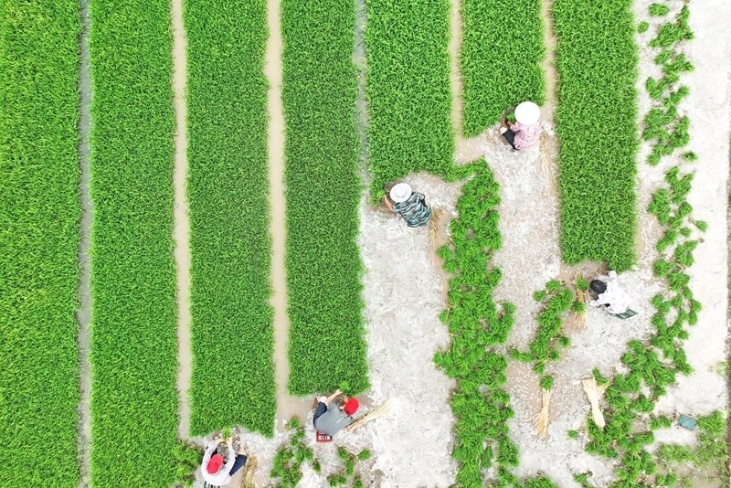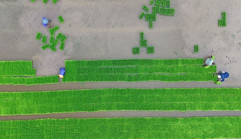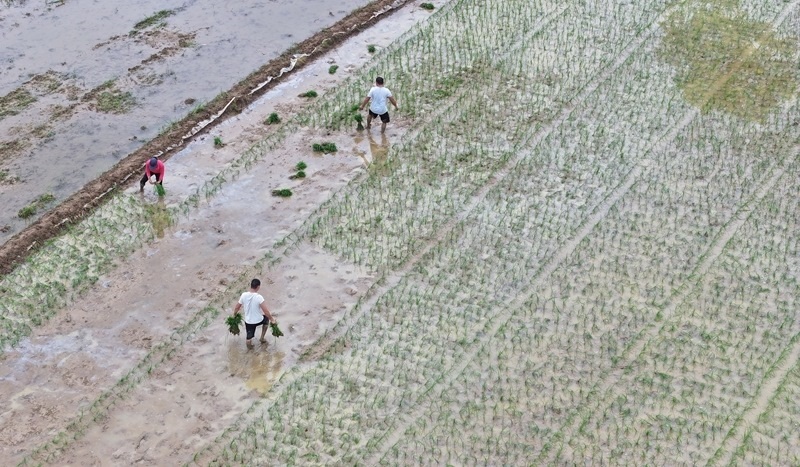 6月11日,在浙江省臺(tái)州市仙居縣雙廟鄉(xiāng),農(nóng)民在田間起運(yùn)秧苗(無人機(jī)照片)。