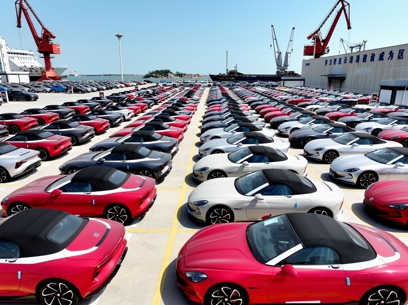 6月16日,在江蘇省連云港港東方港務(wù)分公司碼頭,大批車輛等待裝船外運(yùn)(無人機(jī)照片)。5月份,貨物進(jìn)出口總額38098億元,同比增長2.7%。