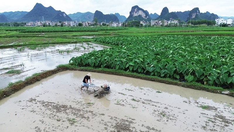 6月19日,廣西賀州市平桂區(qū)鵝塘鎮(zhèn)鵝塘村農民操作農機耕田(無人機照片)。