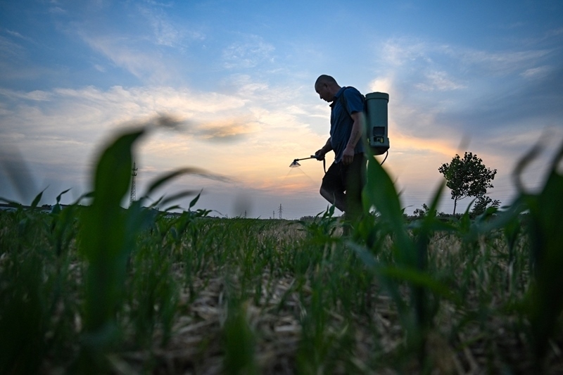6月17日,河南省商丘市夏邑縣會亭鎮(zhèn)南街村村民在玉米田噴施除草劑。