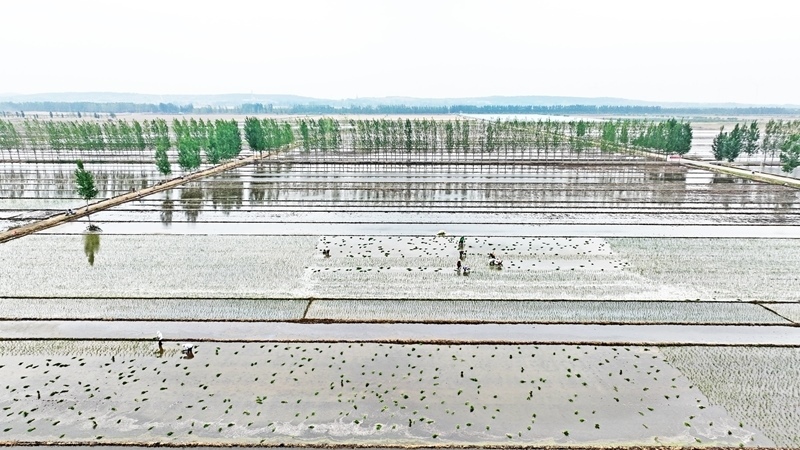 6月19日,山東省臨沂市郯城縣郯城街道農民進行水稻插秧(無人機照片)。
