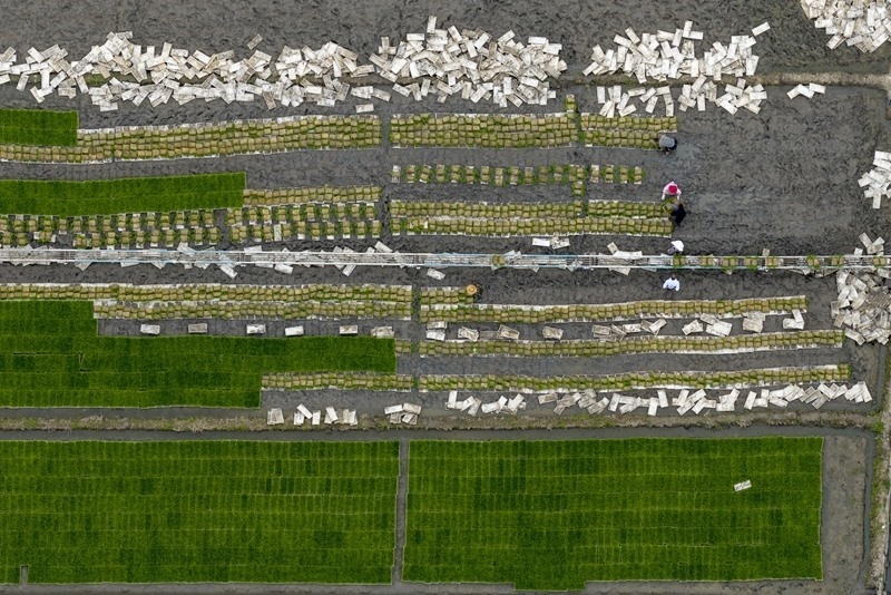 6月18日,在江蘇省海安市墩頭鎮(zhèn)千步村,農民起水稻秧苗,準備進行水稻機插(無人機照片)。