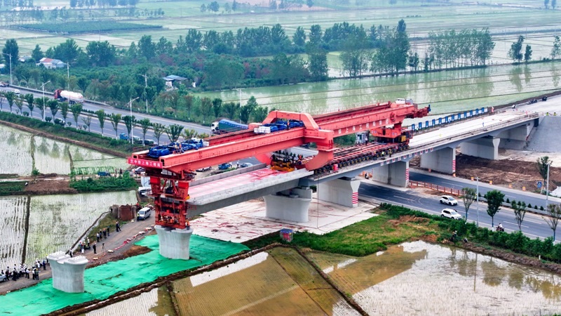 6月21日,在濰宿高鐵郯城沭河特大橋施工現(xiàn)場,中鐵上海局工作人員在進(jìn)行箱梁架設(shè)(無人機(jī)照片)。