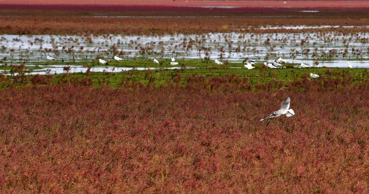 2024年9月14日,海鳥在遼寧省錦州市凌海市紅海灘國家風景廊道紅海灘上空飛翔。新華社記者 周華 攝