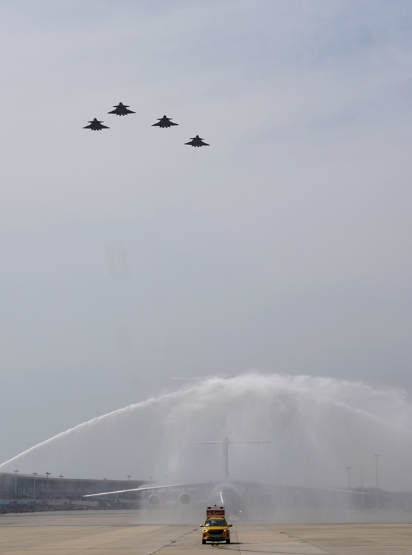 9月12日,第十二批在韓中國(guó)人民志愿軍烈士遺骸回國(guó)。這是在沈陽(yáng)桃仙國(guó)際機(jī)場(chǎng),接運(yùn)烈士遺骸回國(guó)的運(yùn)-20專(zhuān)機(jī)通過(guò)水門(mén)。