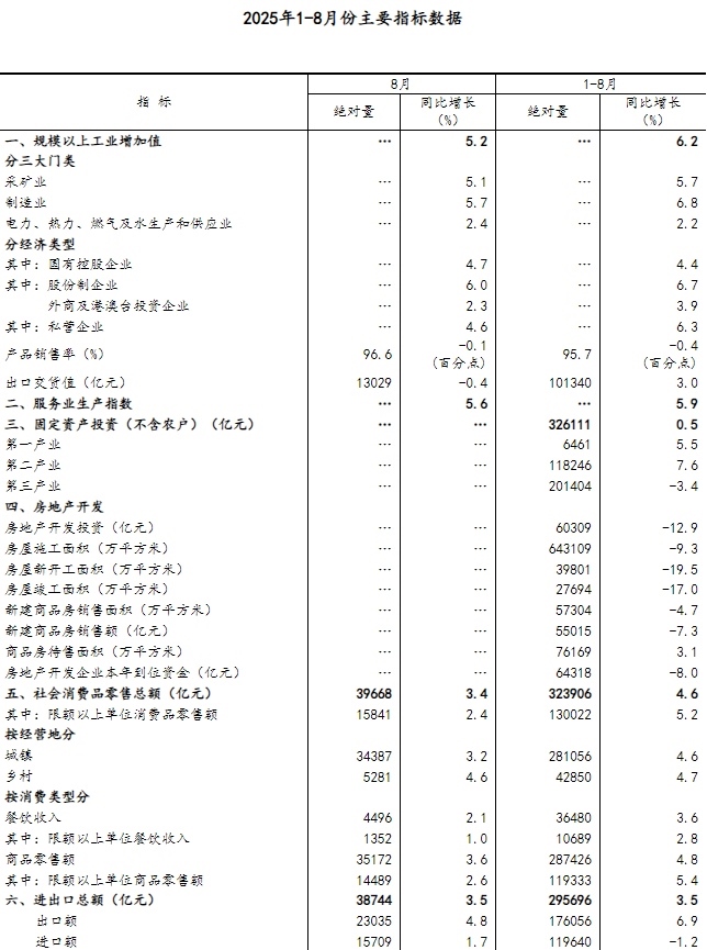8月份,在以習(xí)近平同志為核心的黨中央堅(jiān)強(qiáng)領(lǐng)導(dǎo)下,各地區(qū)各部門認(rèn)真貫徹落實(shí)黨中央、國(guó)務(wù)院決策部署,堅(jiān)持穩(wěn)中求進(jìn)工作總基調(diào),完整準(zhǔn)確全面貫徹新發(fā)展理念,加快構(gòu)建新發(fā)展格局,積極強(qiáng)化宏觀政策調(diào)節(jié),縱深推進(jìn)全國(guó)統(tǒng)一大市場(chǎng)建設(shè),著力做強(qiáng)國(guó)內(nèi)大循環(huán),生產(chǎn)需求基本平穩(wěn),就業(yè)物價(jià)總體穩(wěn)定,新動(dòng)能培育壯大,國(guó)民經(jīng)濟(jì)保持總體平穩(wěn)、穩(wěn)中有進(jìn)發(fā)展態(tài)勢(shì)。