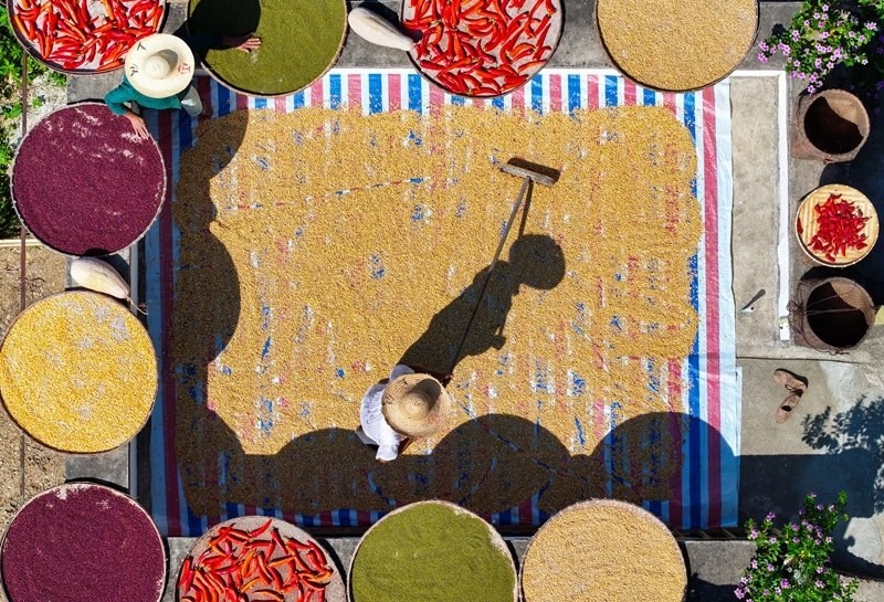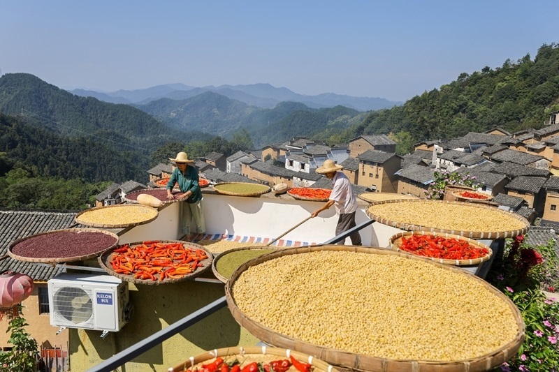 秋收時節(jié),在安徽省黃山市歙縣深渡鎮(zhèn)陽產(chǎn)村,村民利用晴好天氣,抓緊晾曬收獲的辣椒、玉米、山核桃等農(nóng)作物,描繪出一幅山村“曬秋”圖。