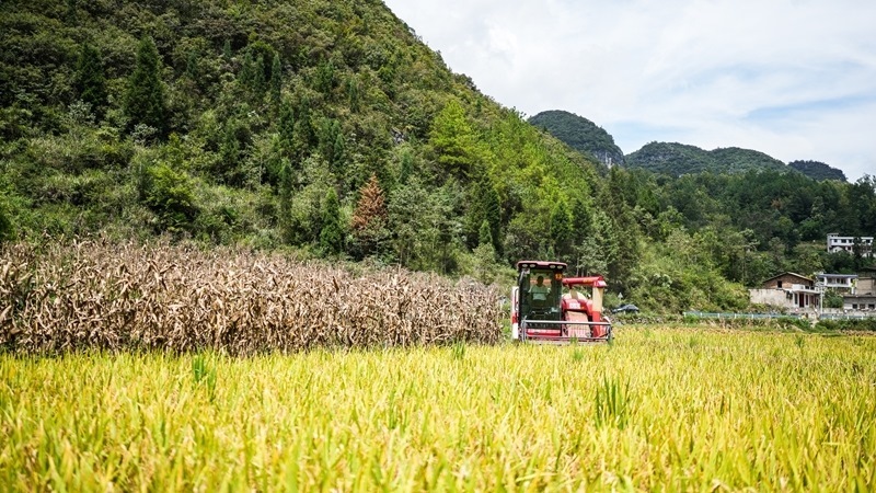 工作人員駕駛農(nóng)用機械在長順縣長寨街道中塘村收割水稻(9月17日攝)。