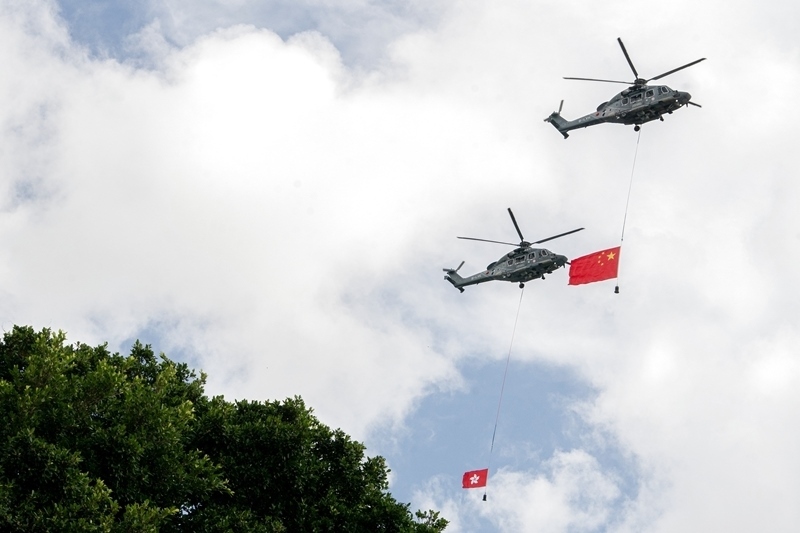 7月1日,香港特區(qū)政府在金紫荊廣場舉行升旗儀式,慶祝香港回歸祖國28周年。這是分別懸掛中華人民共和國國旗、香港特區(qū)區(qū)旗的直升機從空中飛過。