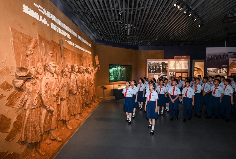 7月7日,北京市第十二中學(xué)的少先隊(duì)員參觀主題展覽。