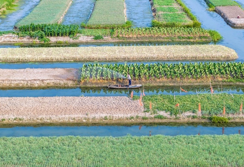 7月7日,在江蘇里下河地區(qū)農(nóng)科所(揚州市農(nóng)科院),農(nóng)民在試驗田勞作(無人機照片)。