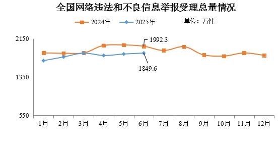 中新網(wǎng)7月9日電 據(jù)“中央網(wǎng)信辦舉報(bào)中心”微信公眾號消息,2025年6月,中央網(wǎng)信辦舉報(bào)中心指導(dǎo)全國各級網(wǎng)信舉報(bào)工作部門、主要網(wǎng)站平臺(tái)受理網(wǎng)民舉報(bào)色情、賭博、侵權(quán)、謠言等違法和不良信息1849.6萬件,環(huán)比增長1.1%、同比下降7.2%。其中,中央網(wǎng)信辦舉報(bào)中心受理舉報(bào)39.8萬件,環(huán)比下降9.5%、同比下降15.1%;各地網(wǎng)信舉報(bào)工作部門受理舉報(bào)63.7萬件,環(huán)比增長6.6%、同比下降50%;全國主要網(wǎng)站平臺(tái)受理舉報(bào)1746.1萬件,環(huán)比增長1.2%、同比下降4%。