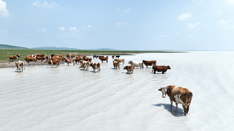 7月11日在內(nèi)蒙古錫林郭勒盟太仆寺旗拍攝的白音查干湖邊的牛群(無(wú)人機(jī)照片)。