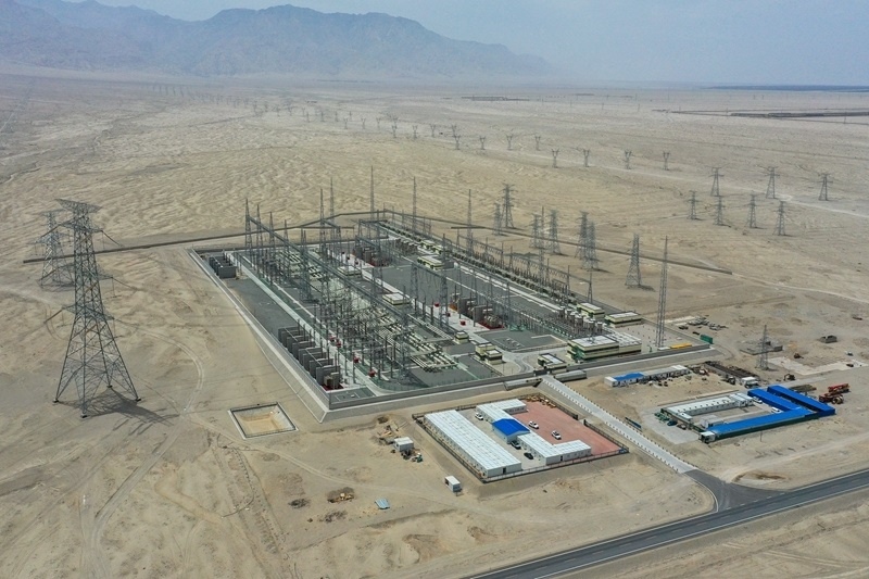 這是已經(jīng)投運的新疆環(huán)塔里木盆地750千伏輸變電工程若羌750千伏變電站(6月27日攝)。