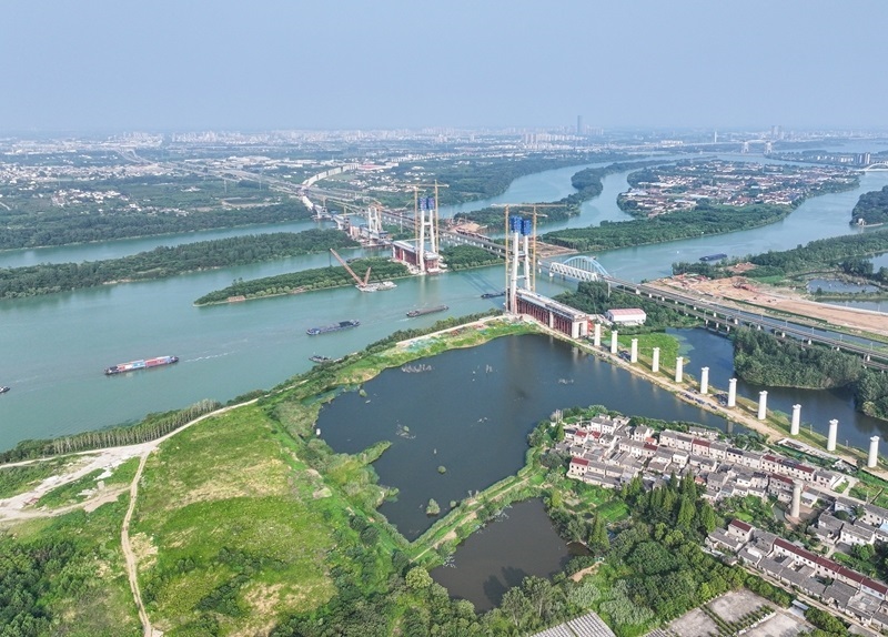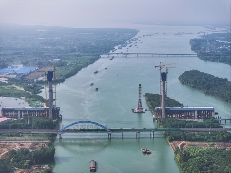 這是滬渝蓉高鐵跨京杭運(yùn)河斜拉橋施工現(xiàn)場(chǎng)(7月13日攝,無人機(jī)照片)。