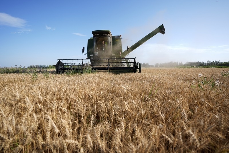 7月15日,收割機(jī)在銀川市賀蘭縣立崗鎮(zhèn)蘭星村收獲小麥。