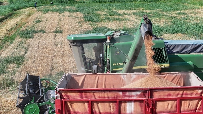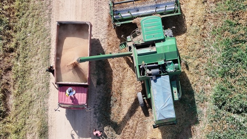 7月15日,收割機(jī)在銀川市賀蘭縣立崗鎮(zhèn)蘭星村收獲小麥(無(wú)人機(jī)照片)。