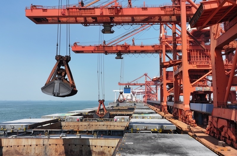 7月18日,一艘輪船靠泊在唐山港曹妃甸港區(qū)礦石碼頭卸載礦物(無人機照片)。