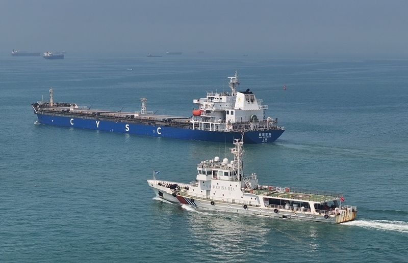 7月18日,曹妃甸海事局的巡邏船(前)在唐山港曹妃甸港區(qū)海域為進出港輪船護航(無人機照片)。