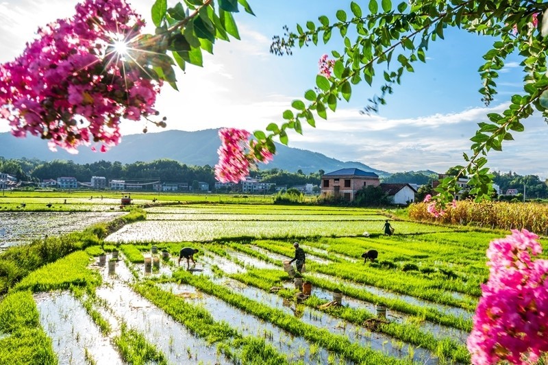 7月21日,農(nóng)民在湖南省婁底市雙峰縣荷葉鎮(zhèn)長(zhǎng)塘村的田間插秧。