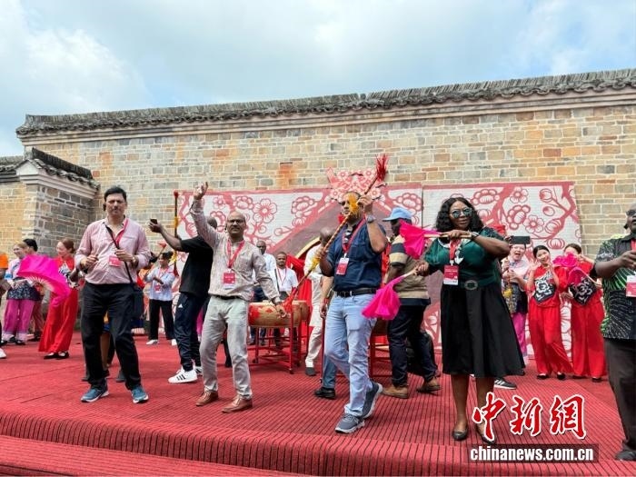中新網(wǎng)7月21日電(記者 黃方) 鼓聲“咚咚咚”在江西贛州龍南市關(guān)西新圍響起,非洲記者大會(huì)秘書(shū)長(zhǎng)威廉·奧洛首次嘗試舞龍。他興奮地?fù)u動(dòng)著龍頭,跟隨節(jié)奏躍動(dòng),忍不住連聲贊嘆:“這太有節(jié)奏感了!”