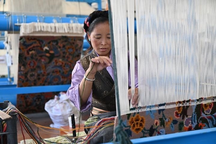 在日喀則市江孜縣的一家藏毯編織車間里,珍拉正盤腿坐在織架前,雙手在密集的經(jīng)線間靈巧地穿梭、挑動(dòng)、打結(jié),一幅寓意吉祥的大鵬金翅鳥圖案,在她手下逐漸成形。