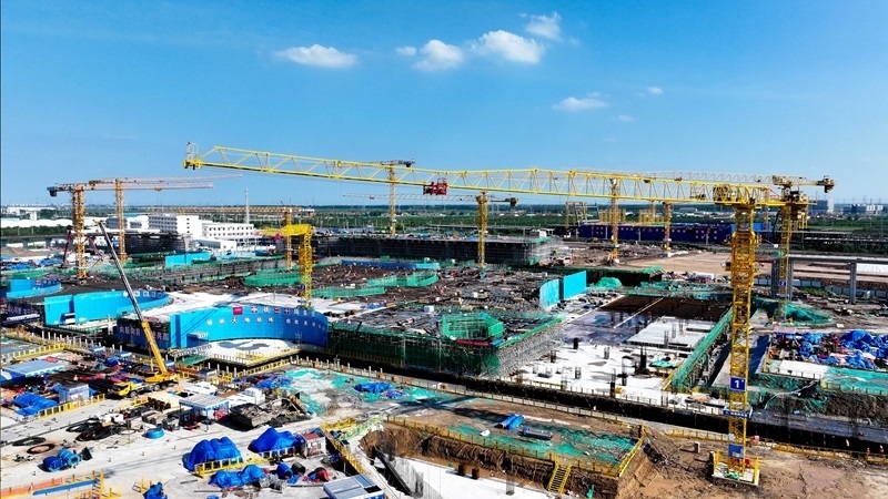 7月25日,在津濰高鐵山東東營高鐵站現(xiàn)代綜合客運(yùn)樞紐及配套工程建設(shè)現(xiàn)場,中鐵二十局工作人員在施工(無人機(jī)照片)。