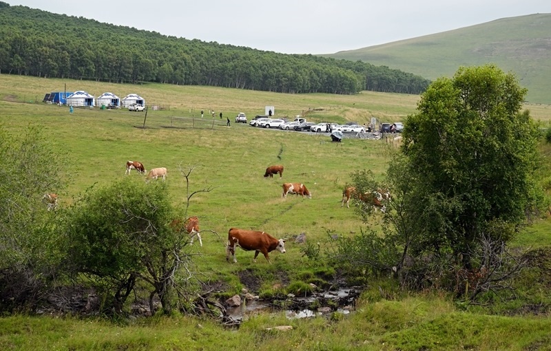 7月24日,自駕游客的車輛停泊在內蒙古自治區(qū)赤峰市克什克騰旗草原的一處牧家樂。