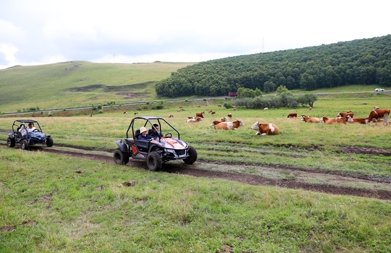 7月24日,游客在內蒙古自治區(qū)赤峰市克什克騰旗草原駕乘草地車。