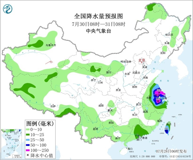 7月29日08時(shí)至30日08時(shí),內(nèi)蒙古東北部、黑龍江北部、吉林中部、遼寧北部、江蘇南部、上海、浙江中東部、臺(tái)灣島中南部、廣東南部等地的部分地區(qū)有大到暴雨,其中,浙江中東部等地的部分地區(qū)有大暴雨(100~200毫米)。內(nèi)蒙古東部有4~5級(jí)風(fēng)。東海大部海域、臺(tái)灣以東洋面偏南海域、巴士海峽將有7~8級(jí)、陣風(fēng)9級(jí)的西南風(fēng),臺(tái)風(fēng)中心經(jīng)過(guò)的附近海域風(fēng)力可達(dá)9~10級(jí)、陣風(fēng)11~12級(jí)。