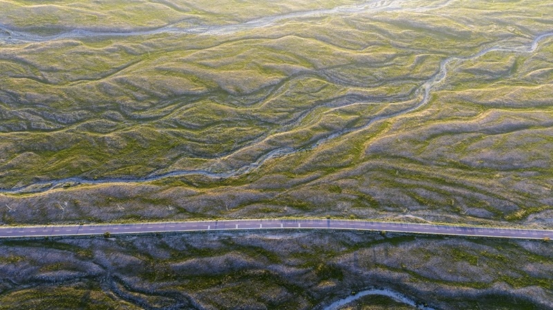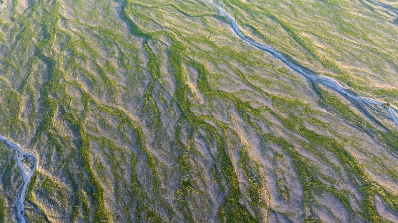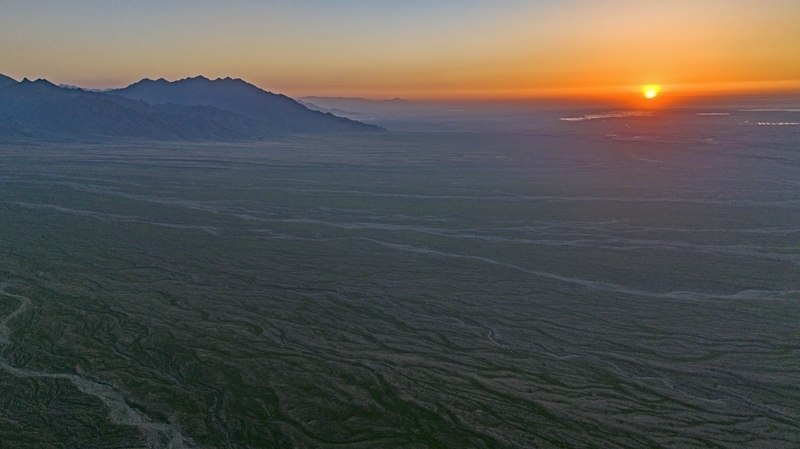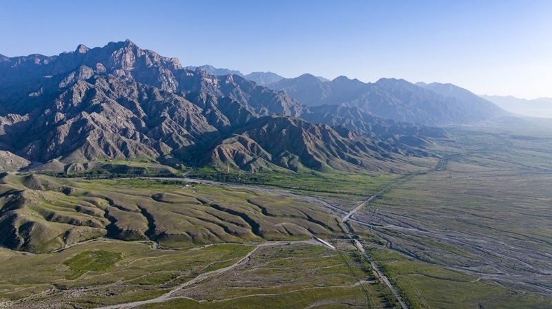 賀蘭山下的戈壁灘草木茂盛(7月29日攝,無(wú)人機(jī)照片)。