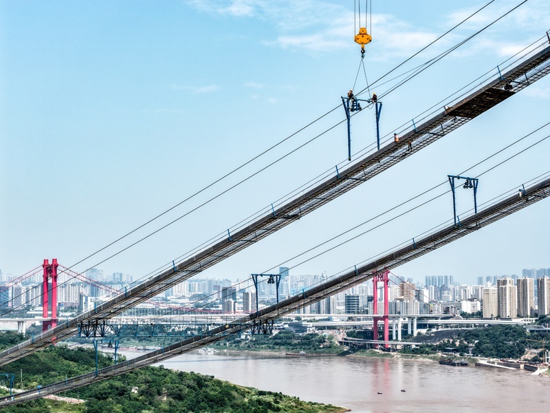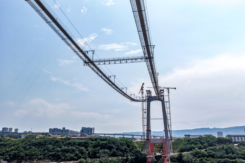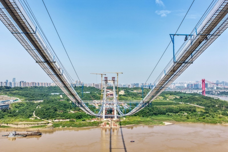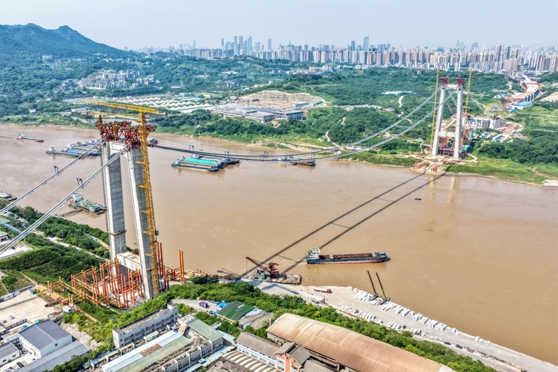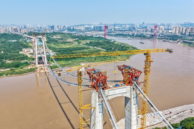 當日,由重慶城投集團投資、城投建設(shè)公司組織建設(shè)、中國鐵建大橋局承建的黃桷沱長江大橋順利完成主纜架設(shè)工作,標志著大橋建設(shè)即將進入鋼桁梁吊裝工序。黃桷沱長江大橋全長1260米,主跨765米,為單跨懸吊雙塔三跨連續(xù)鋼桁梁懸索橋,是國內(nèi)最大跨徑公軌兩用懸索橋。黃桷沱長江大橋是渝長高速復(fù)線連接道工程的控制性節(jié)點工程,建成后將成為聯(lián)系重慶主城區(qū)長江南北兩岸的重要交通干道。