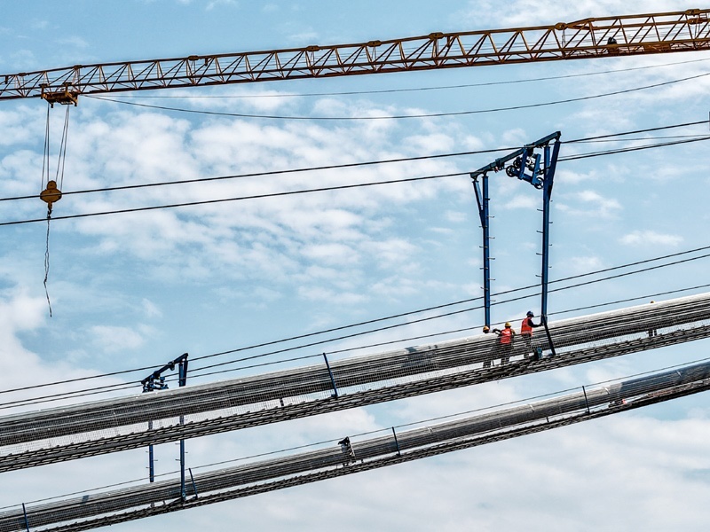 7月30日,在重慶黃桷沱長江大橋建設(shè)現(xiàn)場,工人在施工作業(yè)(無人機照片)。