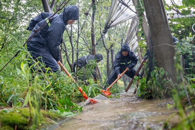 7月30日,在浙江省湖州市長興縣夾浦鎮(zhèn)長平村一處葡萄基地,黨員志愿者、民兵幫助農(nóng)戶排水通渠。