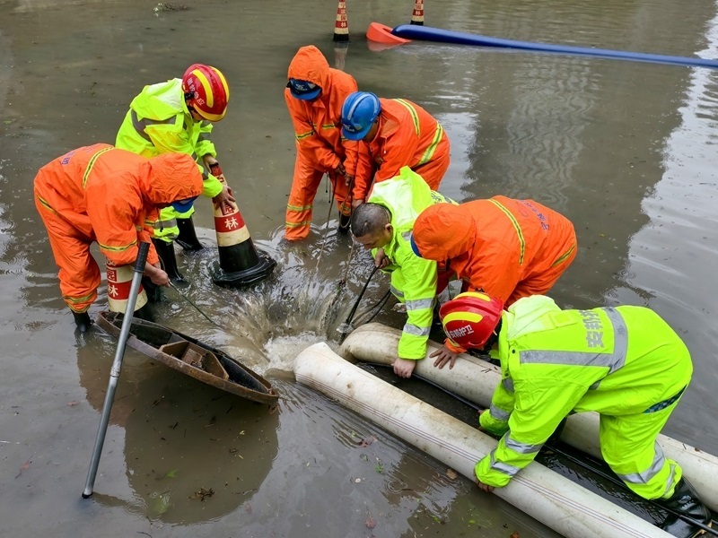 7月30日,浙江省寧波市市政園林等部門救援人員協(xié)同排除道路積水。
