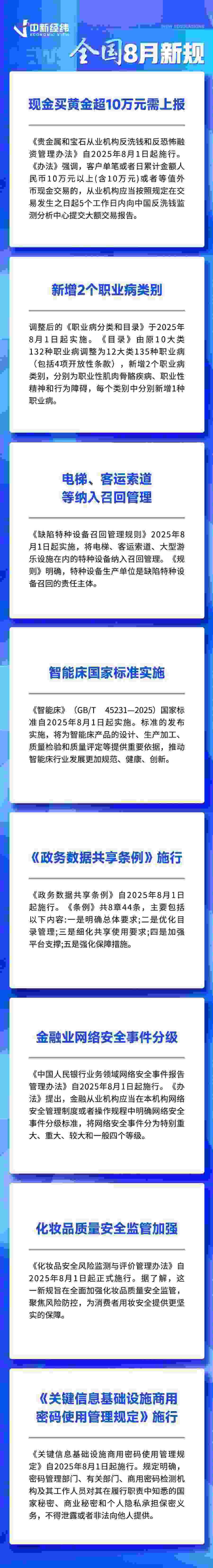 中新經(jīng)緯7月30日電 (熊思怡)現(xiàn)金買黃金超10萬元需上報(bào)、新增2個(gè)職業(yè)病類別、北京取消餐飲經(jīng)營(yíng)場(chǎng)所面積限制……8月,這些新規(guī)事關(guān)你我,一起來看。