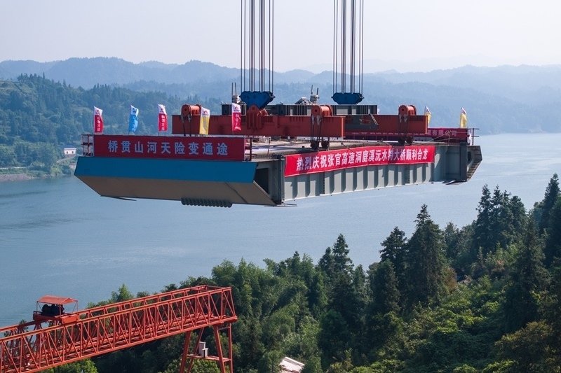 8月3日,在張官高速洞庭溪沅水特大橋施工現(xiàn)場,一塊鋼混結(jié)合梁在被緩緩提升(無人機(jī)照片)。