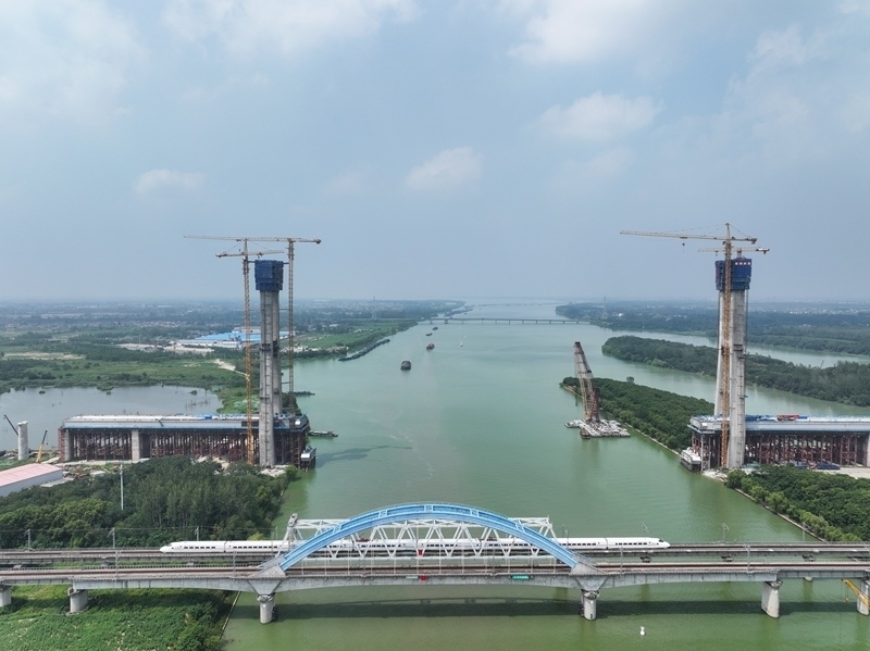 這是8月5日拍攝的滬渝蓉高鐵跨京杭運河斜拉橋建設現(xiàn)場(無人機照片)。