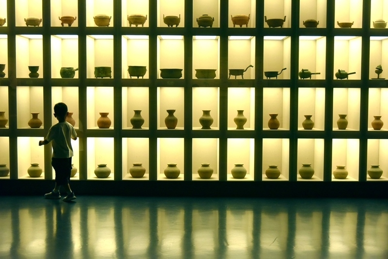 8月10日,小朋友在山東省滕州博物館參觀。
