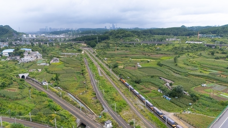 8月19日,貴州首趟多式聯(lián)運(yùn)“一單制”班列從貴陽(yáng)國(guó)際陸港都拉營(yíng)站出發(fā)(無(wú)人機(jī)照片)。