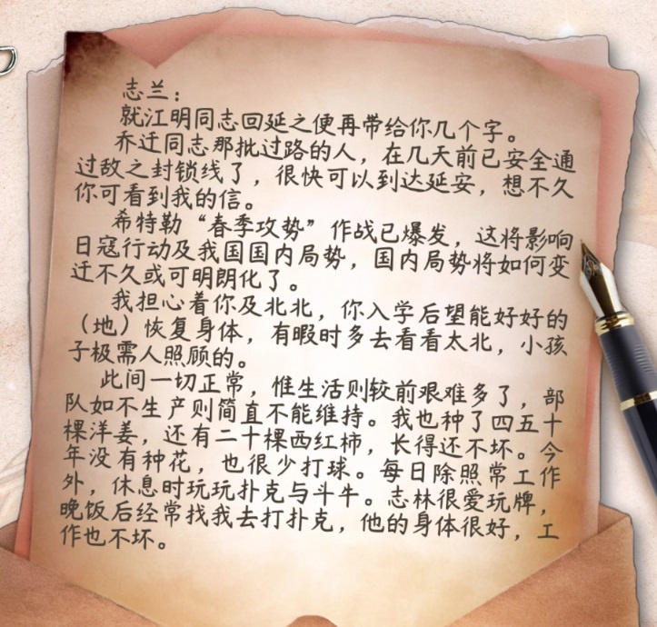 5月22日,日軍離八路軍總部只有十幾公里了,在這樣一個危急時刻,得知有人要去延安,左權(quán)決定給妻子劉志蘭寫一封信,回答她的問題。