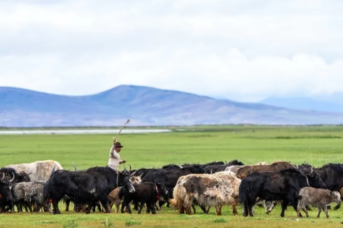 瑪旁雍錯(cuò)濕地上的牦牛。新華社記者 旦增尼瑪曲珠 攝