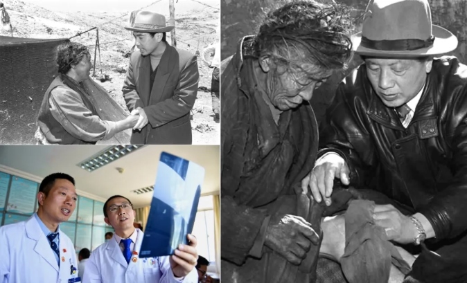 左上圖為來自陜西的援藏干部、阿里日土縣副縣長賈冗勇深入牧區(qū),幫助藏族牧民解決生產(chǎn)、生活的實(shí)際困難(新華社記者土登攝,1997年11月11日發(fā));左下圖為2017年8月3日,北京積水潭醫(yī)院援藏醫(yī)生龔曉峰(右)和北京天壇醫(yī)院援藏醫(yī)生李家謀在拉薩市人民醫(yī)院骨科病房?jī)?nèi)查看患者的X光片(新華社記者晉美多吉攝);右圖為孔繁森(右)在阿里日土縣過巴鄉(xiāng)為孤寡老人益西卓瑪治?。ㄐ氯A社記者土登攝,1994年12月26日發(fā))。