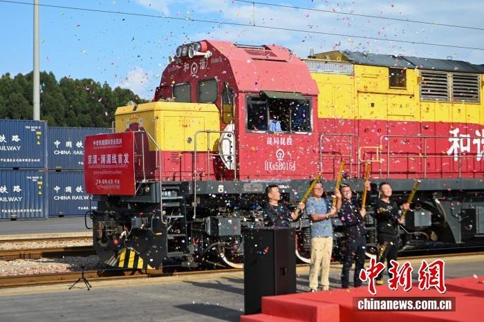 2024年10月14日,首趟滿載老撾進(jìn)口香蕉的中老鐵路“京滇 瀾湄線”國(guó)際貨運(yùn)列車從云南省昆明市王家營(yíng)西站駛出,標(biāo)志著中老鐵路國(guó)際冷鏈班列暨“京滇 瀾湄線”國(guó)際貨運(yùn)列車正式開行。中新社記者 李嘉嫻 攝