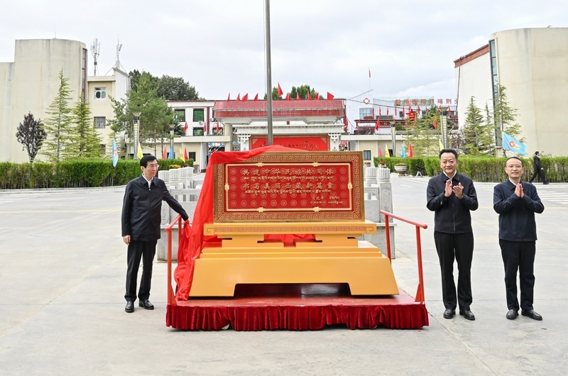 8月23日上午,受習(xí)近平總書記囑托,帶著黨中央的親切關(guān)懷和全國人民的深情祝福,中央代表團(tuán)部分成員在日喀則看望慰問各族干部群眾。這是王滬寧和中央代表團(tuán)部分成員向日喀則市贈(zèng)送賀匾。新華社記者 殷博古 攝