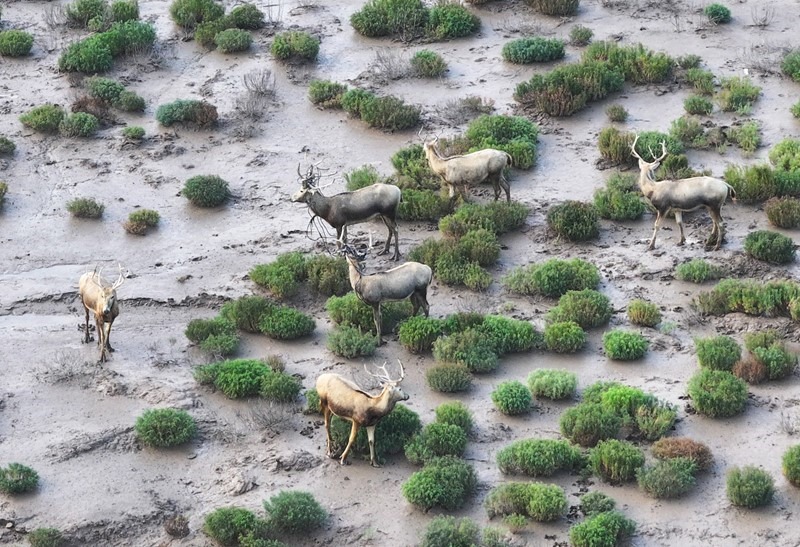 8月25日,野生麋鹿棲息在川水灣(無(wú)人機(jī)照片)。