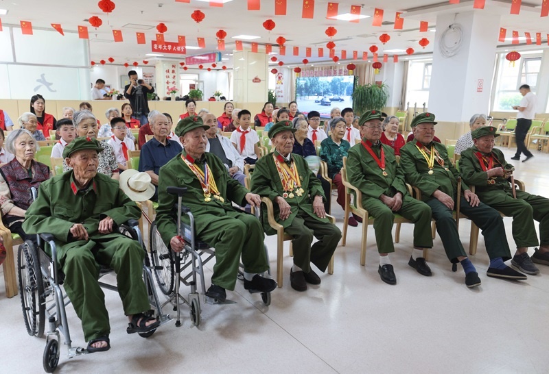 9月3日,在位于山東省臨沂市沂南縣大莊鎮(zhèn)的“山東抗戰(zhàn)老兵照護(hù)中心”,老兵們和志愿者、少先隊(duì)員一起觀看紀(jì)念中國(guó)人民抗日戰(zhàn)爭(zhēng)暨世界反法西斯戰(zhàn)爭(zhēng)勝利80周年大會(huì)直播。