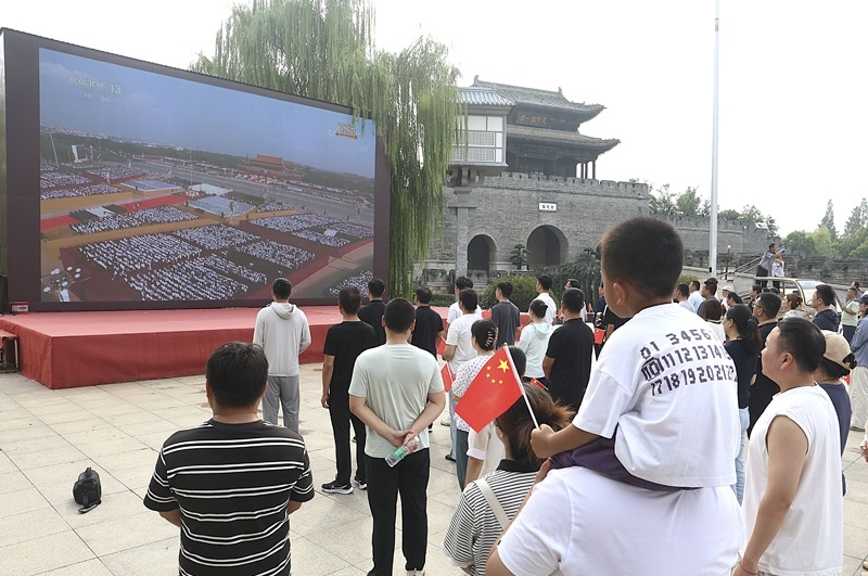 9月3日,游客在山東省棗莊市臺(tái)兒莊古城西門(mén)觀看紀(jì)念中國(guó)人民抗日戰(zhàn)爭(zhēng)暨世界反法西斯戰(zhàn)爭(zhēng)勝利80周年大會(huì)直播。